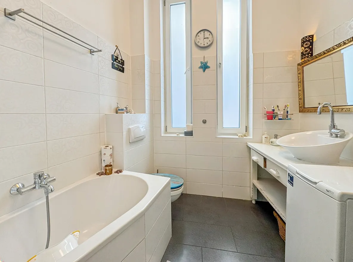 Das Bad mit Fenster verfügt über Badewanne und Dusche.