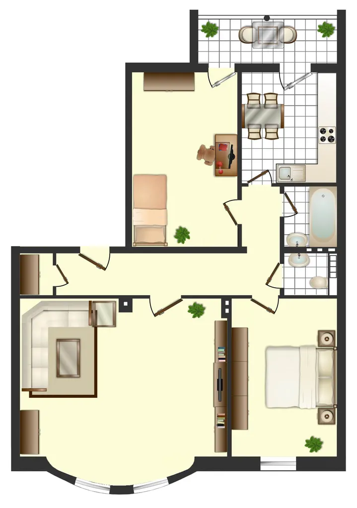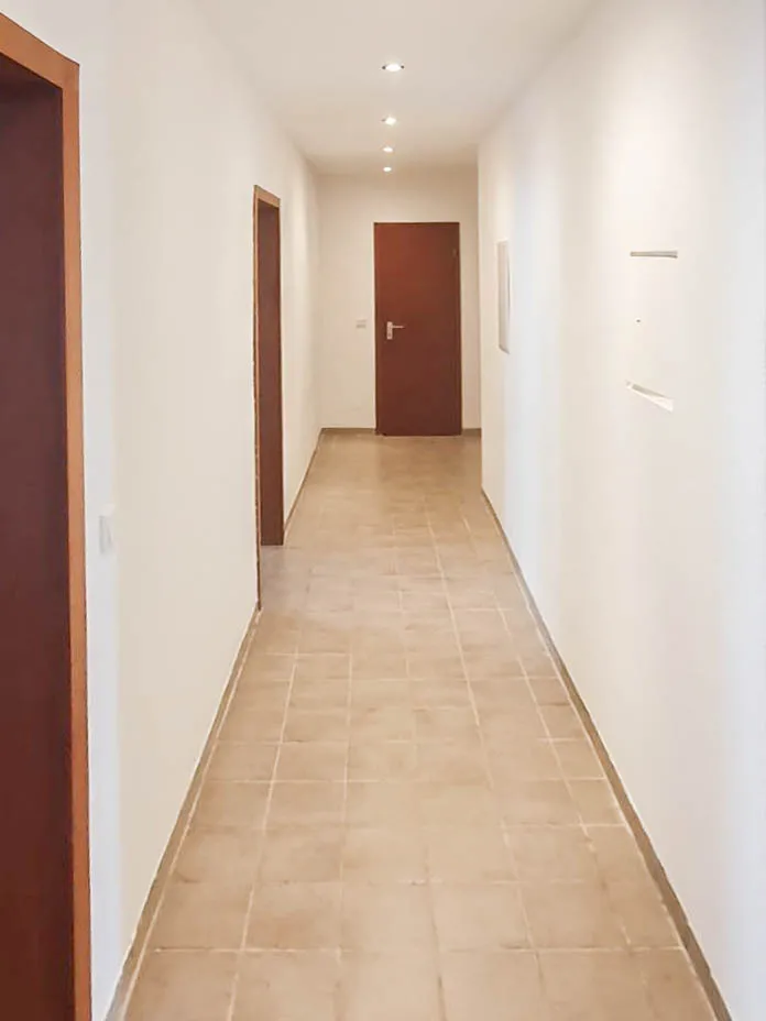 Die Drei-Zimmer-Wohnung im 1. Obergeschoss überzeugt durch eine durchdachte Aufteilung mit einem großzügigen Wohn- und Essbereich, zwei Schlafräumen, einer separaten Küche, Bad und separatem WC. Von Küche und Schlafraum hat man Zugang auf die Loggia.