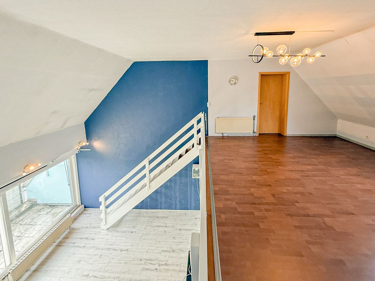 Über die klassische, weiße Massivholztreppe im Wohnbereich gelangt man in die obere Ebene. Hier erschließen sich die Galerie, ein Schlafraum sowie das Tageslichtbad mit Badewanne. Bei Bedarf kann die Wohnung auch in fünf Räume aufgeteilt werden.