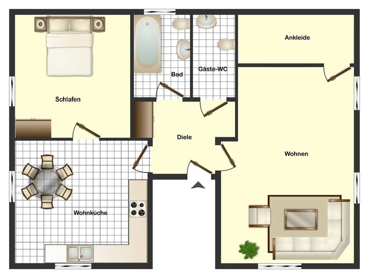 Das Highlight der Wohnung ist der große und offen gestaltete Schlafbereich mit angrenzendem Ankleidezimmer. Die moderne Einbauküche mit Elektrogeräten gehört optional dazu und bietet zusätzlich Platz für einen Essbereich. Ein Wannenbad mit Fenster sowie ein Gäste-WC sorgen für hohen Komfort. Zwei Einbauschränke in der Diele sowie ein Kellerraum sorgen für viel Stauraum.