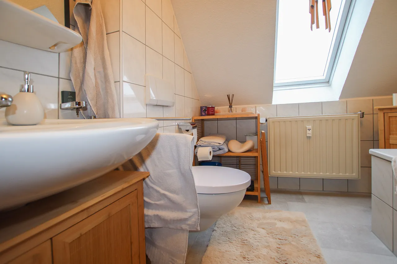 Über eine Treppe vom Wohnbereich aus gelangt man in die obere Wohnebene. Hier erschließt sich ein großzügiger Schlafbereich sowie ein weiteres Bad mit Wanne.
