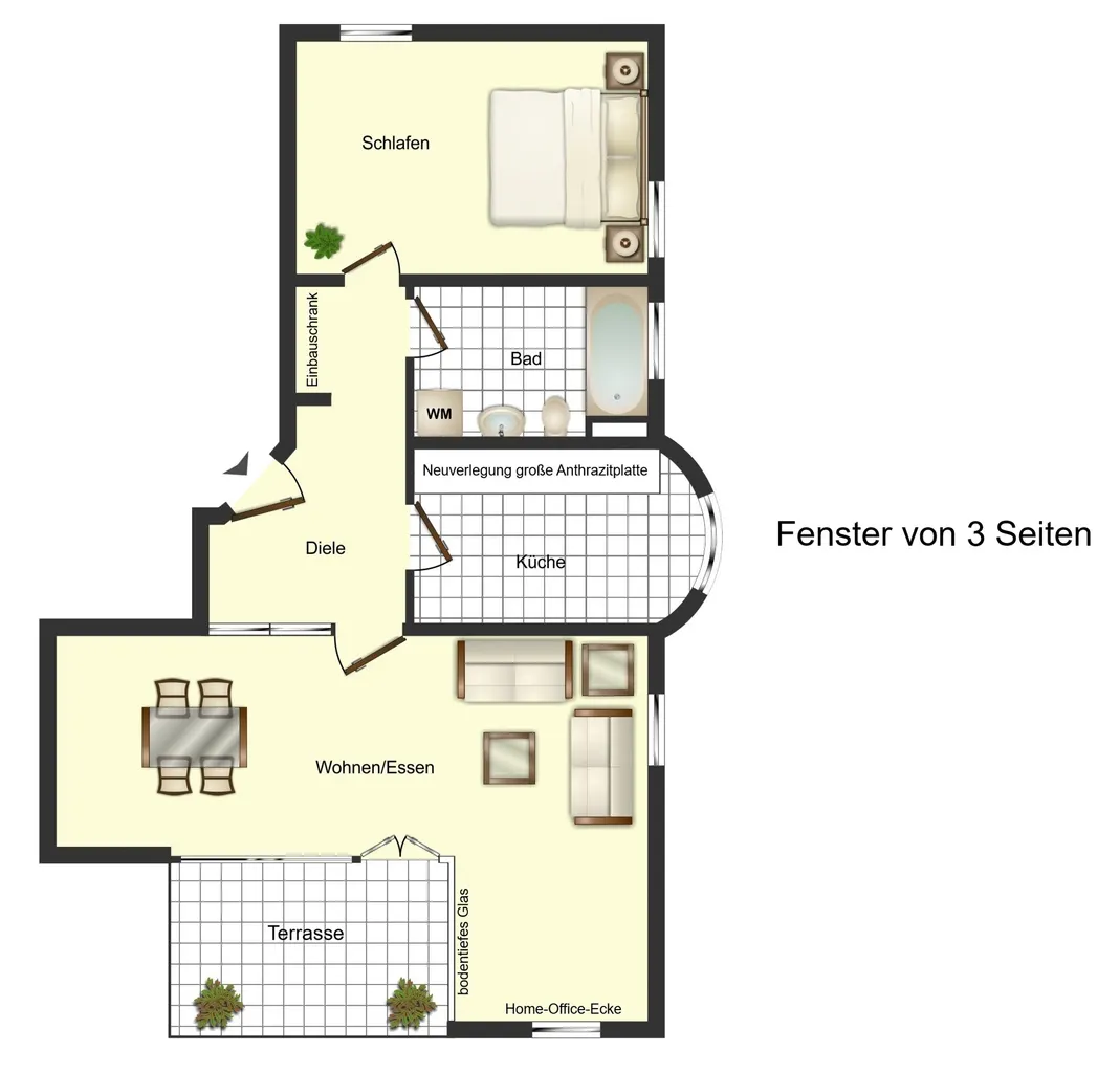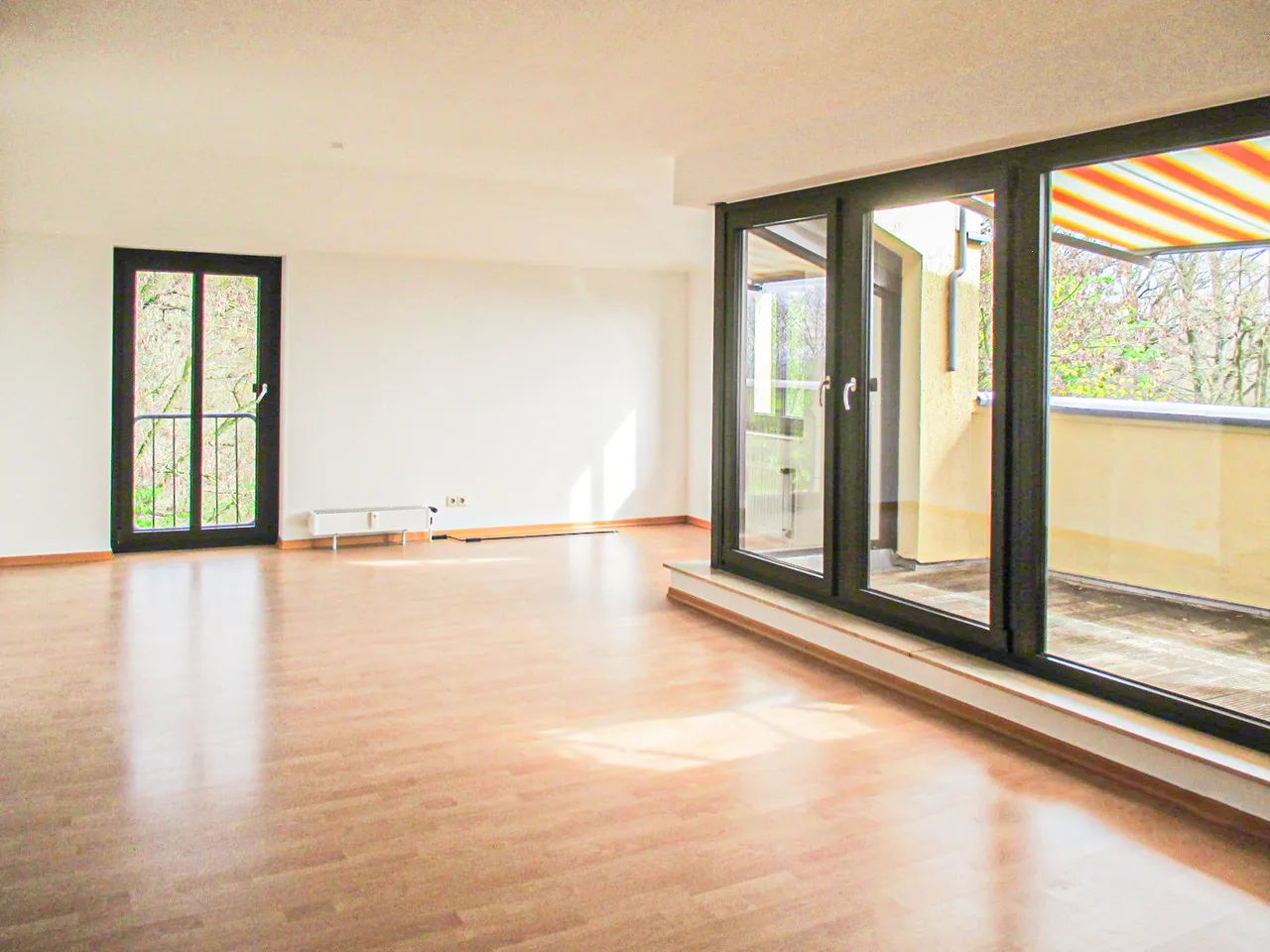 Das Wohnzimmer ist mit tiefen Bodenfenstern und zweiteiliger Flügeltür zur Terrasse ausgestattet. Im Eckbereich neben der Terrasse bietet sich das Home-Office mit viel Licht an. Auf der Terrasse genießen Sie einen herrlichen Blick über die Stadt in die Kölner Bucht. Die große Terrasse bekommt ganz neuen Bangkirai-Boden.