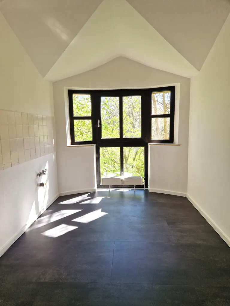 Auch vom Schlafzimmer mit 2 Fenstern und der Küche mit besonders interessanter Fenster-Konstellation = Genuß pur. Die Küche ist mit großen Anthrazit-Platten neu verlegt, der Wand-Küchenspiegel ist im Urzustand, da neu eingebaute Küchen eine farblich abgestimmte Rückwand aufweisen.