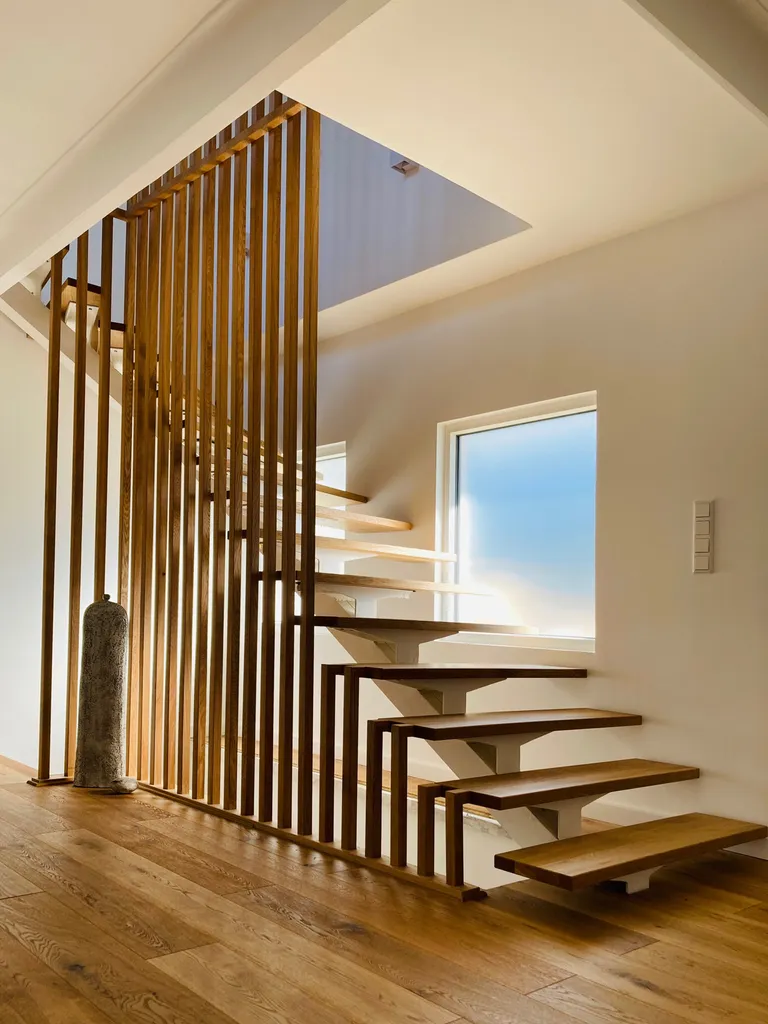 Im Erdgeschoss liegen Wohn-/Essbereich, Schlafraum mit Ankleide und Home-Office. Ein elegantes Bad sowie Gäste-WC ergänzen die Etage. Das Dachgeschoss beherbergt zwei schöne große Räume mit Bad und eine Terrasse. Im Untergeschoss ist ein Gäste-Appartement mit Bad und eigenem Eingang eingerichtet. Weitere Räume für Gym und Hobby schließen sich an.