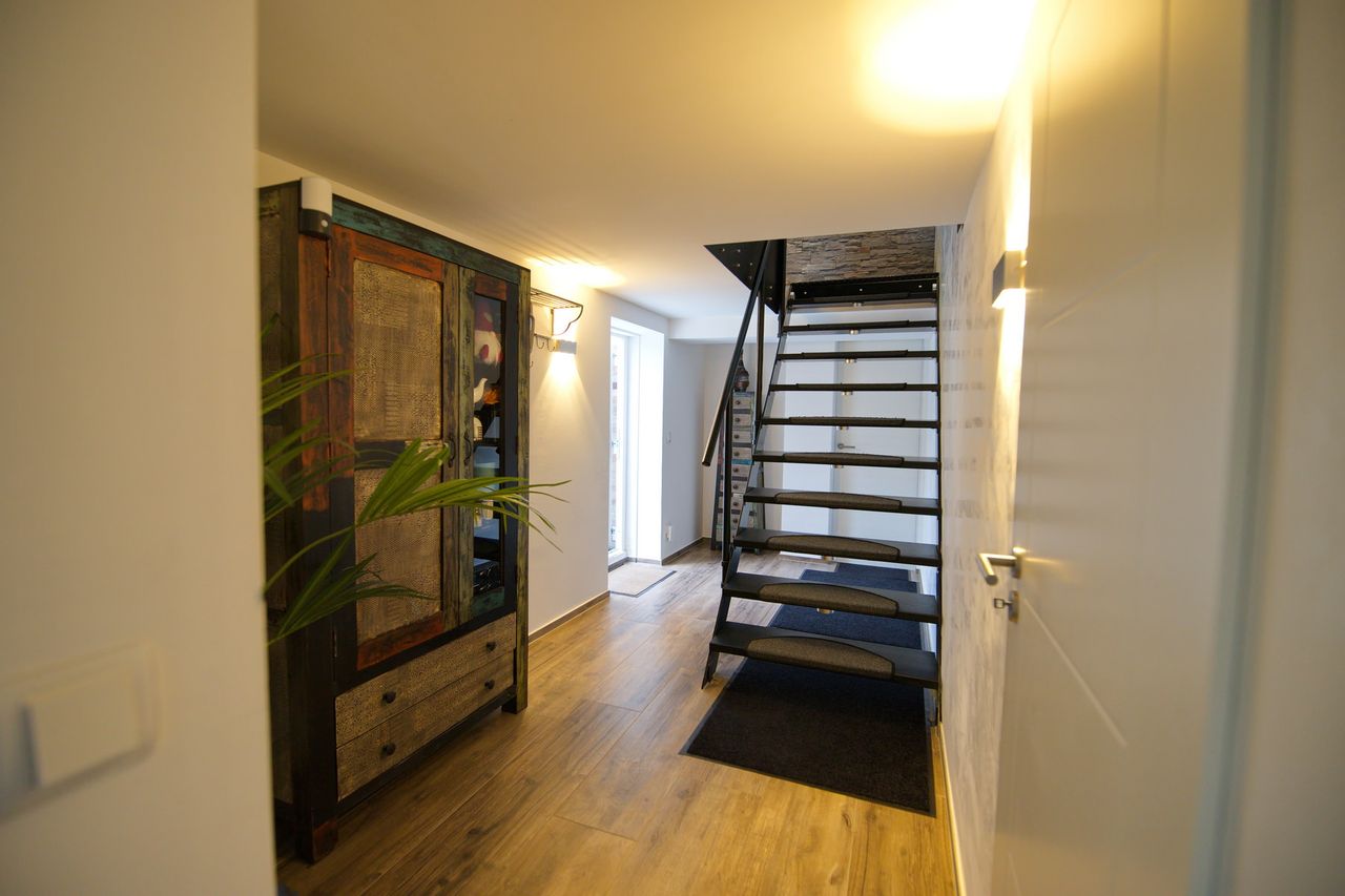Die Hauptwohnung im Erdgeschoss erstreckt sich bis ins wohnlich ausgebaute Untergeschoss. Auf ca. 135 m² verteilen sich bis zu fünf großzügige Räume.