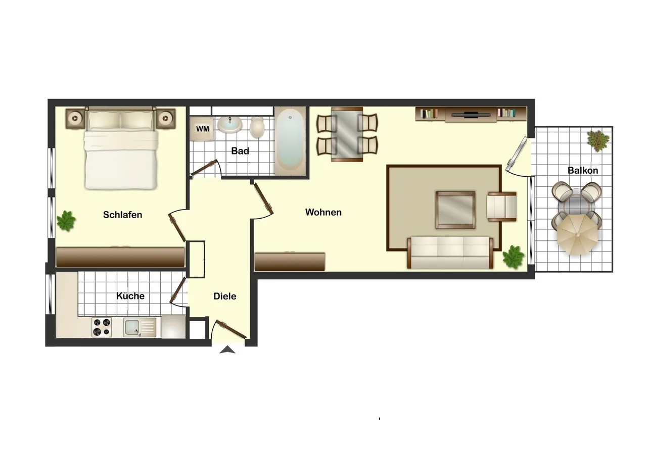Das helle Schlafzimmer und das zeitlose Wannenbad mit Waschmaschinenanschluss runden das Angebot ab.