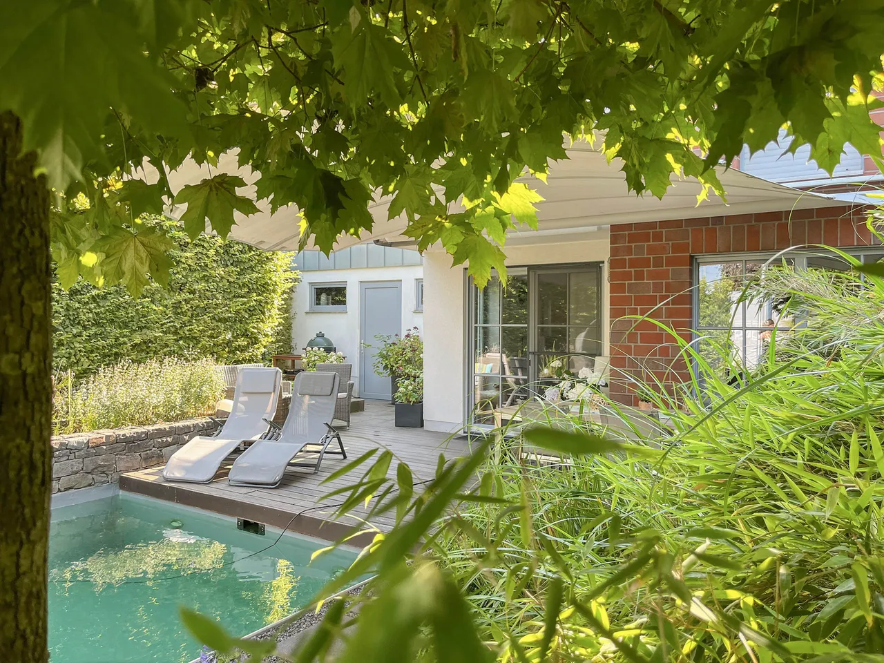 Die liebevoll angelegte Gartenanlage wurde von einem Gartenarchitekten gestaltet. Die elegante Bepflanzung sorgt für Sichtschutz.
