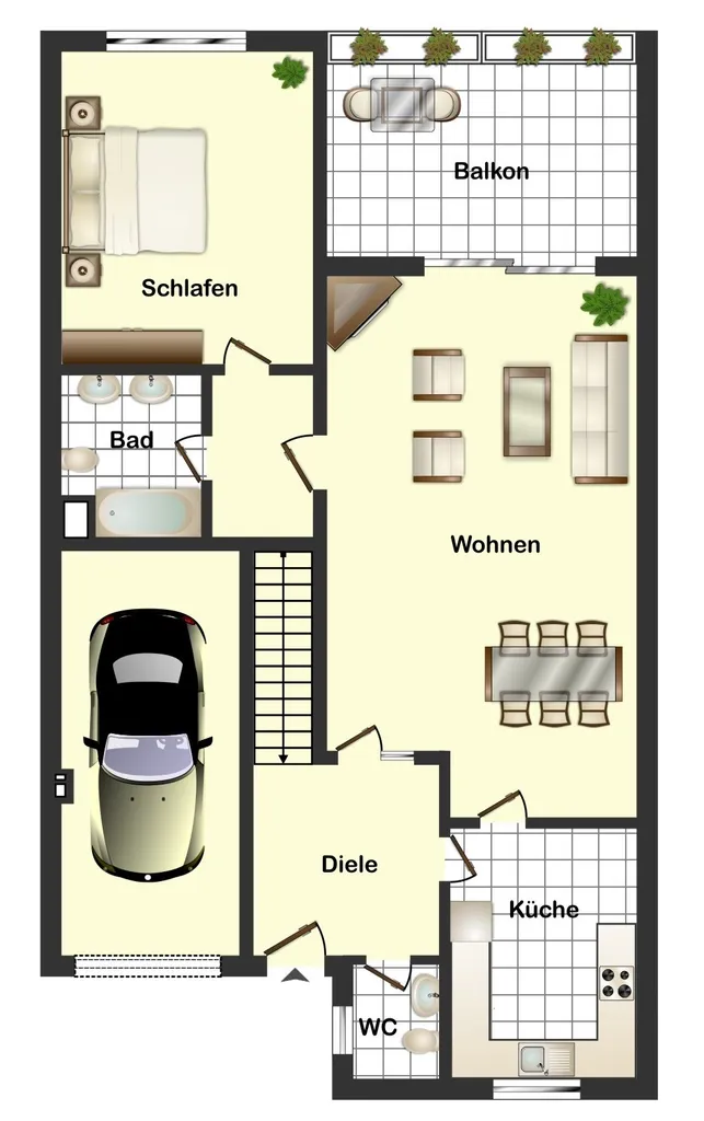 Wohnbereich, Küche und Diele sind mit hochwertigen Fliesen ausgestattet - pflegeleicht und Allergiker gerecht. Ein Schlafraum, modernes Wannenbad und Gäste-WC komplettieren die Eingangsebene.